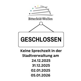 Am 22.12.2025 (Montag), 23.12.2025 (Dienstag), 29.12.2025 (Montag) und am 30.12.2025 (Dienstag) finden wie gewohnt die Sprechzeiten der Stadt Bitterfeld-Wolfen statt. Eine Terminvereinbarung wäre wünschenswert.