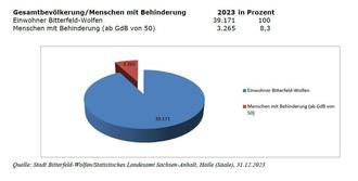 In der Stadt Bitterfeld-Wolfen leben 3.265 Menschen mit Schwerbehinderung. Das sind 8,3 % der Gesamtbevölkerung der Stadt Bitterfeld-Wolfen (Stand 31.12.2023).