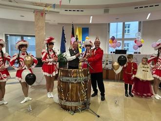 Nach dem Kanonenschuss um 11:11 Uhr übergab Oberbürgermeister Armin Schenk den Rathausschlüssel und die Stadtkasse an den FKT-Präsidenten Olaf Kracke und an die Thalheimer Funkengarde. Foto: Stab Öffentlichkeitsarbeit/Marketing