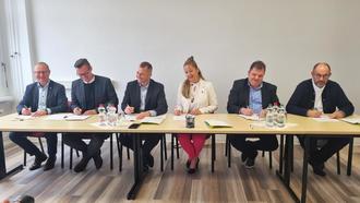 Oberbürgermeister Armin Schenk (Bitterfeld-Wolfen), Bürgermeister Matthias Egert (Zörbig), Bürgermeister Ferid Giebler (Muldestausee), Bürgermeisterin Steffi Syska (Sandersdorf-Brehna), Bürgermeister Hannes Loth (Raguhn-Jeßnitz) und Bürgermeister Thomas Schneider (Südliches Anhalt, v. l. n. r.) unterzeichnen die kommunale Vereinbarung zur gemeinsamen Raumplanung und der Planung eines erneuerbaren Energieausbaus.