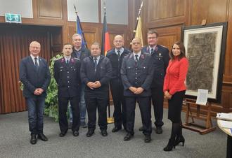 Die Ehrenbeamten reihten sich für ein Erinnerungsfoto auf. Vordere Reihe: Oberbürgermeister Armin Schenk, Tobias Meier, Steffen Schneeweiß, Mathias Liesche, Bürgermeisterin Heike Krauel; hintere Reihe: Sebastian Gries (Sachbereichsleiter Brandschutz), Ingo Baer und Sven Emde.