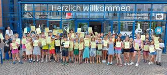 Die teilnehmenden Kinder zeigen erfreut ihre Zertifikate vom „SommerLese-Club“ 2025.