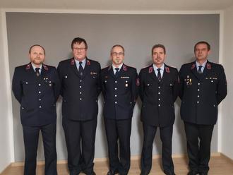 Die Freiwillige Feuerwehr wünscht frohe Weihnachten (v. l. n. r.): André Hempel (stellvertr. Stadtwehrleiter für Presse- und Medienarbeit/Nachwuchs- und Mitgliedergewinnung), Sven Emde (Stellvertr. Stadtwehrleiter für Technik und Beschaffung), Dr. Sven Rißland (Stadtwehrleiter), Daniel Lüdecke (Stellvertr. Stadtwehrleiter für Aus- und Fortbildung) und Steffen Lüdecke (Stadtjugendfeuerwehrwart).