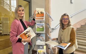 Veronika Olejnicki und Oxana Reidel-Rostalsky (r.) präsentieren die neue Familienbroschüre, die die bisherigen Service-Broschüren wie „Bitterfeld-Wolfen erleben“ und die Vorsorgemappe um ein weiteres Format ergänzen.