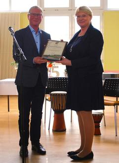 Oberbürgermeister Armin Schenk überreicht die Ehrenurkunde an die Leiterin der Fördergruppe Silvia Manske.