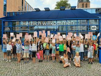 Die teilnehmenden Kinder zeigen erfreut ihre Zertifikate vom „SommerLeseClub“.