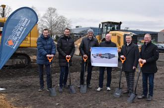 Den Spatenstich vollzogen Oberbürgermeister Armin Schenk, Landrat Andy Grabner, Niederlassungsleiter Maik Leuschner, Geschäftsführer Uwe und Richard Rothkegel sowie Philipp Rothkegel (v. r. n. l.)