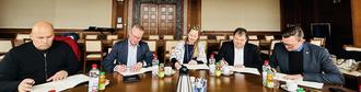 Oberbürgermeister Armin Schenk (2.v.l.) unterzeichnet gemeinsam mit Christian Dubiel (Geschäftsführer der BSG), Steffi Syska (Bürgermeisterin der Stadt Sandersdorf-Brehna), Hannes Loth (Bürgermeister der Stadt Raguhn-Jeßnitz) und Matthias Egert (Bürgermeister der Stadt Zörbig) die interkomunale Vereinbarung zur Nutzung der Schwimmbäder und dem Irrgarten für Mitglieder der Freiwilligen Feuerwehren.