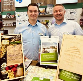 Marcel Urban, persönlicher Referent des Oberbürgermeisters, und Steve Bruder, Leiter des Stabs Wirtschaftsförderung (v. l.), stellen die Bitterfeld-Wolfener Feinkost-Box den Gästen auf der "Grünen Woche" in Berlin vor.
