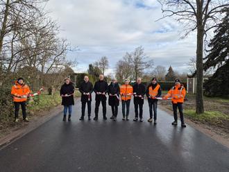 Die sanierte Kreisstraße K 2055 ist offiziell für den Verkehr freigegeben: Michael Audörsch (Fachbereichsleiter Bau beim Landkreis Anhalt-Bitterfeld), Katja Krusch (Sachbereichsleiterin Tiefbau, Stadt Bitterfeld-Wolfen), Volker Krüger (stellvertretender Landrat des Landkreises Anhalt-Bitterfeld), Andreas Rößler (Leiter des Dezernats IV für Bauen, ländliche Entwicklung, Umwelt und Verbraucherschutz), Annett Westphal (Ortsbürgermeisterin des Ortsteils Rödgen), Christine Döring (Fachdienstleiterin für Tiefbau und Straßenmeisterei des Landkreises Anhalt-Bitterfeld), Oberbürgermeister Armin Schenk, Christian Scholz (Niederlassungsleiter KEMNA BAU OST GmbH & Co. KG) und Dirk Lajewski (Oberbauleiter KEMNA BAU OST GmbH & Co. KG) schneiden symbolisch das Band durch.