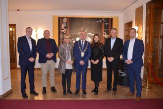 (1) Gemeinsam Verantwortung tragen: Oberbürgermeister Armin Schenk, Bürgermeisterin Heike Krauel, Stadtratsvorsitzender Henning Dornack sowie die Geschäftsführerin und die Geschäftsführer der kommunalen Familie beim Neujahrsempfang im Städtischen Kulturhaus.