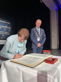 (6) Ein Moment voller Würde: „Anni“ Wischner trug sich in das Goldene Buch der Stadt Bitterfeld-Wolfen ein – als Zeichen des Dankes für ihr jahrzehntelanges ehrenamtliches Engagement.