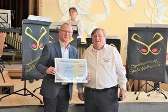 Oberbürgermeister Armin Schenk übernahm die Schirmherrschaft und überreichte dem Vorsitzenden des „Spielmannzug Stadt Wolfen e. V.“ einen Scheck