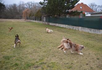 Die Hunde der Vereinsmitglieder des "Hundefreunde Bitterfeld e. V." spielen auf der Auslauf-Wiese.