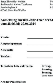 Bei Interesse an einer Teilnahme mit Ihrem Verein oder Ihrer Initiative am Veranstaltungswochenende „800 Jahre Bitterfeld“, melden Sie sich bitte unter der E-Mail-Adresse 800jahre@bitterfeld-wolfen.de. Wenn die „zündende“ Idee für die Realisation noch fehlt, hilft Ihnen unser 800-Jahre-Organisationsteam auch hier gern weiter.