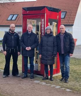 Die äußere Verwandlung und der Innenausbau sind gelungen: Am 29. Januar weihten Oberbürgermeister Armin Schenk und Ortsbürgermeister Imre Starke gemeinsam mit Cornelia Siebert vom Verein „Natürlich Reuden e. V.“ und Tischler Steffen Berndt die leuchtend dunkelrote „Bücherbox“ im Ortsteil Reuden ein.