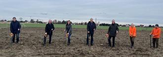 Am Freitag, den 23. Februar, pflanzten der Oberbürgermeister Armin Schenk (2.v.l.), die stellvertretende Bürgermeisterin des Verbandsmitgliedes Stadt Sandersdorf-Brehna, Sabine Montag (3.v.l.), der Ortsbürgermeister des Orsteils Thalheim, Uwe Bruchmüller (4.v.l.), Karsten Westphal als Vertreter des benachbarten Ortsteils Rödgen (l.) und der Verbandsgeschäftsführer des Zweckverbandes TechnologiePark Mitteldeutschland, Clemens Mai (3.v.r.), unter fachlicher Anleitung der Geschäftsführung des mit der Aufforstung beauftragten Unternehmens GEBELER Forstbetrieb (r.) und mit tatkräftiger Unterstützung von Bürgerinnen und Bürgern aus Thalheim sowie von Mitgliedern der Verbandsversammlung die letzten der 81.000 Bäume.