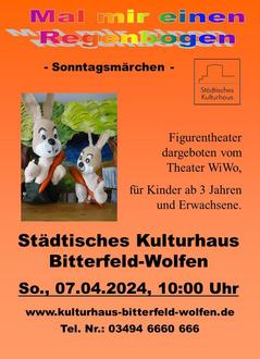 Am Sonntag, 07. April, 10:00 Uhr ist das Figurentheater im Städtischen Kulturhaus zu Gast. Das erwartet die Kleinsten ab 3 Jahren: Das kleine Häschen Hoppel hat so etwas Schönes noch nie gesehen – einen Regenbogen am Himmel. Doch während Opa Hase die Farben aufzählt, ist der Regenbogen auch schon wieder verschwunden. „Weißt du was,“ tröstet der Opa, „wir malen einen Regenbogen.“ Voller Begeisterung werden die Vorbereitungen getroffen. Da kommt aus dem Garten der Nachbarin ganz ungelegen ihr frecher Kater angeschlichen und sorgt für ein tolles Durcheinander. Zum Glück weiß Opa Hase Rat.