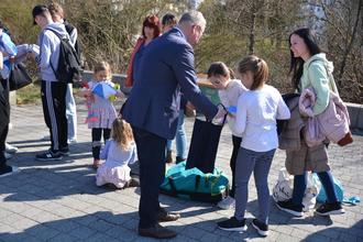 Oberbürgermeister Armin Schenk verteilte Wasserbälle mit Stadt-Logo an die Jüngsten für noch mehr Badespaß.