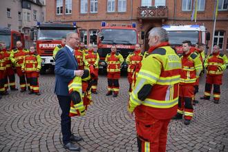 Oberbürgermeister Armin Schenk übergab die neue Schutzkleidung symbolisch an die Kameradinnen und Kameraden der Feuerwehren am 18. März auf dem Bitterfelder Marktplatz.