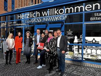 Stadt- und Tourismusinformation Bitterfeld-Wolfen wurde mit dem roten "i" des DTV ausgezeichnet in Abwesenheit von Stefanie Pötzsch (Staatssekretärin im Ministerium für Wirtschaft, Tourismus, Landwirtschaft und Forsten des Landes Sachsen-Anhalt, 3.v.l.), Lars-Jörn Zimmer (MdL, Mi.), Heike Krauel (Bürgermeisterin, 2.v.l.), Joachim Teichmann (Leiter des Amtes für Bildung/Kultur/Soziales, r.), Gabriela Schulze (Sachbereichsleiterin Kultur/Tourismus, 3.v.r.), Jutta Zacharias Lange (hält die Auszeichnung, Mi.) und Silke Gräfe (Mitarbeiterinnen der Stadt- und Tourismusinformation, li.) sowie Klaus Suchantke (2.v.r.) und Peter Dürrschmidt (4.v.r.) vom "Goitzsche Info-Point".