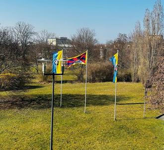 Die Tibet-Flagge ist in der Mitte zu sehen.