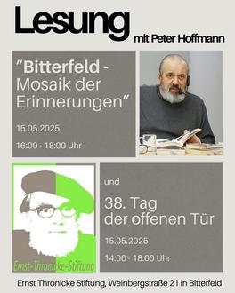 An diesem Tag präsentiert Peter Hoffmann eine Lesung „Bitterfeld – Mosaik der Erinnerungen“. Der Autor hat über Jahrzehnte die Erinnerungen von Einwohnern der Stadt Bitterfeld-Wolfen gesammelt. Die entstandenen Texte erzählen von prägenden Erlebnissen, bedeutenden Orten und bewegenden Momenten der Stadtgeschichte. Dabei wird nicht nur Vergangenes lebendig – auch der Humor kommt nicht zu kurz.