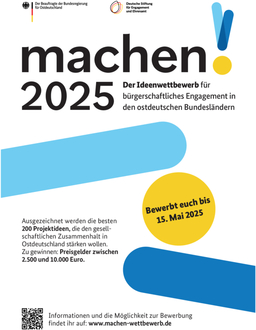 Auf den Ideen-Wettbewerb „machen!2025“ möchte die Deutsche Stiftung für Engagement und Ehrenamt (DSEE) hinweisen: Bis zum 15. Mai können sich gemeinnützige Organisationen aus ostdeutschen Städten und Gemeinden mit bis zu 50.000 Einwohnerinnen und Einwohnern mit ihren Ideen für „machen!2025“ bewerben. Gesucht werden kreative Ideen, die das Miteinander stärken und die Gestaltungskraft aller vor Ort fördern. Die besten 200 Einreichungen werden mit einem Preisgeld zwischen 2.500 und 10.000 Euro ausgezeichnet. Weitere Informationen erhalten Sie unter: www.machen-wettbewerb.de.