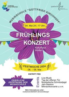 Mit dem Erwachen der Natur erwacht auch die Musik in uns – und nichts stimmt Sie besser darauf ein als das traditionelle Frühlingskonzert der Musikschule „Gottfried Kirchhoff“ im Städtischen Kulturhaus in Wolfen. Wir laden Sie hierzu am 4. Mai 2024, um 17:00 Uhr, herzlichst ein.