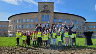 Die Kinder der Kita "Campus Kids" legten mit der WBG Wolfen mbH eine Blühwiese vor dem Rathaus an.