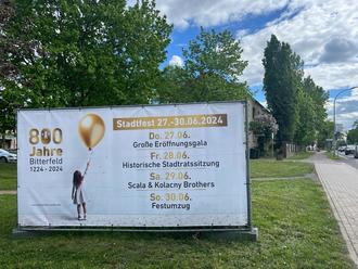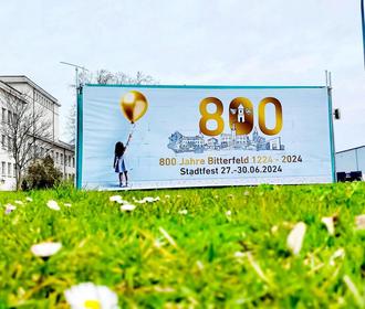 Der Stab Öffentlichkeitsarbeit/Marketing hat weitere neue Marketingaktivitäten für die „800-Jahr-Feier“ auf den Weg gebracht: An mehr als zehn Standorten wurden Bauzaunbanner im gesamten Stadtgebiet aufgestellt. Außerdem erhielt der Container am Kulturpalast die Bespannung mit den Worten „800 Jahre Bitterfeld 1224 – 2024, Stadtfest 27. – 30.06.2024“, um darauf aufmerksam zu machen.