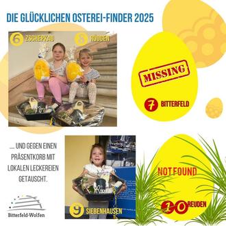 Auch in diesem Jahr wurden in allen Ortsteilen von Bitterfeld-Wolfen wieder Super-Eier versteckt – und inzwischen haben alle glücklichen Finderinnen und Finder ihre wohlverdienten Präsentkörbe entgegengenommen. Die Freude über die bunt gefüllten Körbe war groß, und viele Beteiligte nahmen mit Begeisterung an der mittlerweile traditionellen Osteraktion teil.