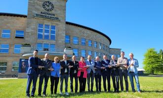 Vertreter der Telekom sowie die Geschäftsführer und Vorstände der Bitterfeld-Wolfener Wohnungsunternehmen besiegeln in Anwesenheit von Oberbürgermeister Armin Schenk (5. v. r.) die Zusammenarbeit für den Glasfaserausbau Foto: Stab Öffentlichkeitsarbeit/Marketing