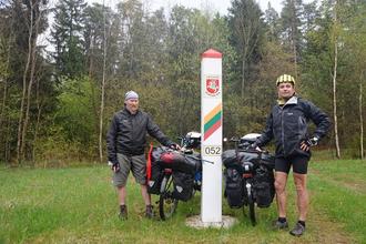 Weltenradler Thomas Meixner (re.) und Torsten Zabel am Grenzpfeiler zu Litauen.