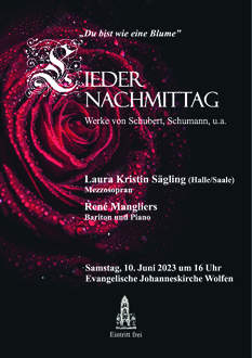 Zu Gast ist die Mezzosopranistin Laura Kristin Sägling aus Bitterfeld. Sie singt auch gemeinsam im Duett und wird am Piano begleitet von Kantor René Mangliers. Es erklingen Lieder von Robert Schumann und Felix Mendelssohn Bartholdy. Juliane Claus aus Halle (Saale) wird dazu aus dem bewegten Leben Robert Schumanns berichten und auch aus seinen Briefen lesen. Die Lieder stehen in engem Zusammenhang mit der Heirat seiner Frau Clara Wieck. Im Mittelpunkt des Konzertes steht der Zyklus „Frauenliebe und leben“ op. 42 von Robert Schumann. Der Eintritt zum Konzert ist frei.