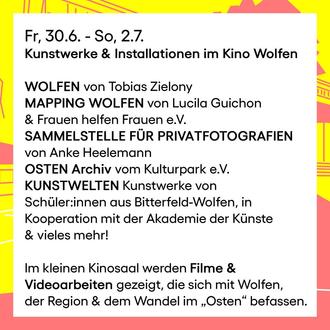 Das Team um den Kulturpark e. V. lädt vom 30. Juni bis 2. Juli zum gemeinsamen Auftakt für das nächste Festival OSTEN im Jahr 2024 und zum Austausch über die Umbrüche in Bitterfeld-Wolfen in das denkmalgeschützte und aktuell leerstehende Kino Wolfen ein. Besucherinnen und Besucher erwartet ein vielseitiges Kultur-Programm aus Workshops, Auftritten, Filmvorführungen, einem Konzert und vielem mehr. Alle Veranstaltungen können kostenfrei besucht werden.
