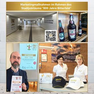 (1) Die Stadt Bitterfeld-Wolfen hat den Tunnel im Bitterfelder Bahnhofsgebäude, der zu den Bahnsteigen führt, bekleben lassen. (2) In einer Sonderedition der Bitterfelder Brauerei bietet diese ein Fest-Bier zum Stadtjubiläum an. (3) Im Rahmen der 4. Kunst- und Kulturwoche stellt der Autor Benny Berger die historische Festschrift zu „800 Jahre Bitterfeld“ am 23. Juni, um 14:00 Uhr, in der Sommer Lounge mit Hofbühne am Historischen Rathaus Bitterfeld vor. (4) Auch eine eigene Bekleidungskollektion als Erinnerung an die Festveranstaltung ist von paartoo design in Kooperation mit der Stadt Bitterfeld-Wolfen auf den Weg gebracht worden. Die ersten Artikel und die Genussbox, die u.a. das Bitterfelder Fest-Bier beinhaltet, sind in der Stadt- und Tourismusinformation, Markt 7, 06749 Bitterfeld-Wolfen, erhältlich.