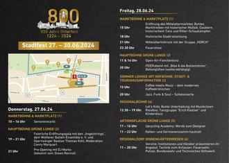 Alle Programmpunkte, Informationen zu Künstlern und Bands, eine kurze Historie Bitterfelds sowie sämtliche Informationen zu Parkplätzen, kostenlosem Shuttle-Service oder der Anreise mit Bus und Bahn fasst die Festbroschüre „800 Jahre Bitterfeld“ im handlichen A5-Format zusammen und bietet einen kompakten Überblick. Diese liegt in der Stadt- und Tourismusinformation im Ortsteil Stadt Bitterfeld und im Rathaus Wolfen aus. Für alle, die lieber digital auf sämtliche Informationen zugreifen wollen, gibt es die Broschüre zum Download unter www.bitterfeld-wolfen.de/programm800.