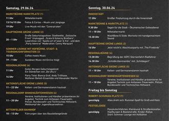 In mehreren Szenen historischer Stadtratssitzungen zeigen amtierende Lokalpolitiker in einem Theaterstück am Freitag, 28. Juni, um 18:00 Uhr, auf der Marktbühne, wie städtische Politik in den letzten 100 Jahren voranschritt. Dabei werden alle Szenen von einem Versdichter auf eine heitere Art kommentiert. Die Gruppe „HORCH“ präsentiert Mittelalterfolkrock vom Feinsten. Parallel laden Sie die Stimmungskanonen von „Biba & die Butzemänner“ zur Feierabendparty auf der Hauptbühne in der Grünen Lunge ein. Mit ihrer Titelauswahl deckt die Band einen breiten Musikgeschmack ab. So gibt es Songs der 50er, 60er, 70er, 80er, 90er bis hin zu aktuellen Chart-Titeln. Diese versehen sie oft mit eigenen Texten und bringen mit verschiedenen Outfits jede Menge Spaß und Unterhaltung.