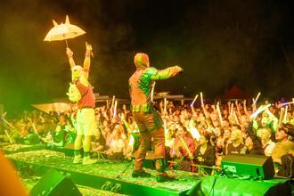 Regen macht echten Schildegart-Fans nichts aus. Sänger Pascal „Bocki“ Bock holte alle Kinder kurzerhand auf die Bühne und tanzte dort mit ihnen den Schildkröten-Mambo.