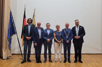 Während der Feierstunde anwesedn waren Daniel Schulz, stellv. Bürgermeister der Stadt Marl, Patrick Nicole-Williams, Bürgermeister der Stadt Villefontaine (Frankreich), Janusz Chodasewicz, Bürgermeister der Stadt Kammienna Góra (Polen), Maryvonne Roux, stellv. Bürgermeisterin der Stadt Vierzon (Frankreich), Oberbürgermeister Armin Schenk und Tobias Bosselmann, stellv. Bürgermeister der Stadt Witten (v. l. n. r.).