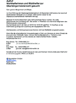 zur Durchführung der Oberbürgermeisterwahl am 24. September 2023 sowie einer eventuell stattfindenden Stichwahl am 8. Oktober 2023 werden wieder für die Wahllokale/Briefwahllokale Wahlhelfer benötigt.