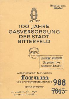 Das Archivale mit der Signatur HSTAB 988 befindet sich im Historischen Endarchiv und kann im Stadtarchiv Bitterfeld-Wolfen, im Ortsteil Stadt Bitterfeld, eingesehen werden. Dieses Heft im DIN-A4-Format umfasst 21 Seiten und ist in einem braunen Einband gebunden. Es wurde vom wissenschaftlichen Forum VEB Energieversorgung Halle zum hundertjährigen Bestehen der Gasversorgung in Bitterfeld herausgegeben. Das Zitat am Anfang des Heftes