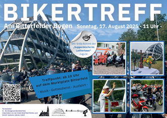 Am Sonntag, dem 17. August, lädt die Evangelische Kirchengemeinde Bitterfeld gemeinsam mit der Stadt Bitterfeld-Wolfen, der Musikschule "Gottfried Kirchhoff" Bitterfeld-Wolfen und der Motorradstaffel der Polizeiinspektion Ost (Dessau) zum Bikertreff am Bitterfelder Bogen ein. Alle Motorradfreunde und Interessierte sind herzlich willkommen, an diesem besonderen Tag teilzunehmen.
