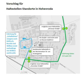 Zum Abschluss wurde die neue Möglichkeit, den Busverkehr für Hohenroda zu gestalten, diskutiert. Ein neuer Vorschlag der Verkehrsgesellschaft ist es, ab August 2024 die neue Buslinie 214 (Delitzsch - Eilenburg) über die Brinniser und Krensitzer Straße zu führen, mit den beiden möglichen Haltepunkten im Bereich der Luckowehnaer und der Mocherwitzer Straße. Dafür müsste allerdings im Bereich Luckowehnaer Straße eine Baumaßnahme durchgeführt werden, weil auf der östlichen Seite ein Fußweg fehlt.