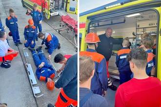 Am Dienstag (09.05.2023) verlegte unsere KTW-Besatzung aus der Rettungswache im Bad Dübener Postweg hinüber in die Bitterfelder Straße. In der dortigen Feuerwache nahm sie gerne die Einladung der Kinder und Jugendlichen der Freiwilligen Feuerwehr Bad Düben an. Gemeinsam übten Rettungswachenleiter Swen Rasenberger und Sanitäter Daniel Rakowski mit den angehenden Floriansjüngern die Menschenrettung mithilfe von Treppensteiger, Tragetuch und Schaufeltrage. Zudem gab es eine ausführliche Einweisung in das Equipment des Krankentransportwagens. Die ursprüngliche Zusage, auch den neuen Koffer-RTW mitzubringen, konnte wegen eines Realeinsatzes nicht gehalten werden – aber aufgeschoben ist nicht aufgehoben …