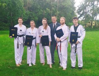 Danach musste jeder Prüfling unter seinem kritischen Blick das für den angestrebten Gürtel erforderliche Programm abwickeln. Von Formenlauf, Zweikampf, Ilbo Taeryon, Selbstverteidigung und Bruchtest war alles dabei. Fünf Teilnehmer bestanden ihre Prüfung und bekamen feierlich Ihre Dan-Urkunden überreicht. Auch unsere heimische Sportlerin meisterte ihre Prüfung bravourös. Maria Fiedler erhielt ihre 1. Dan-Graduierung und bekam anschließend von Taekwondo-Meister Steffen Heinrich ihren schwarzen Gürtel überreicht. Somit können wir nun in unserem Verein eine Taekwondo-Meisterin begrüßen.