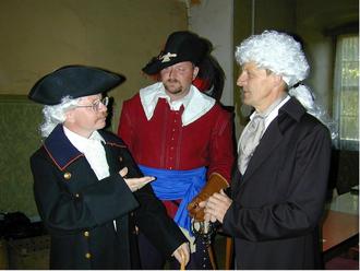Gellert (Christoph Ahlemann, 1. v.r.) im Gespräch mit Friedrich II. (Hartmut Schöttge, 1. v.l.) und Major Quintus (Frank Schade, 2. v.r.) zum 3. Gellert-Abend 1997 im Foyer des Barockschlosses Schön-Wölkau.