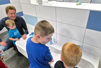Gemeindevertreter Dr. Nico Lehmann probiert mit den Kindern das neue Waschbecken aus