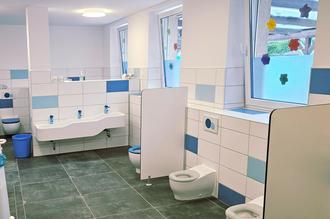 Hell und kindgerecht umgestalteter Sanitärraum im Kindergarten Gänseblümchen